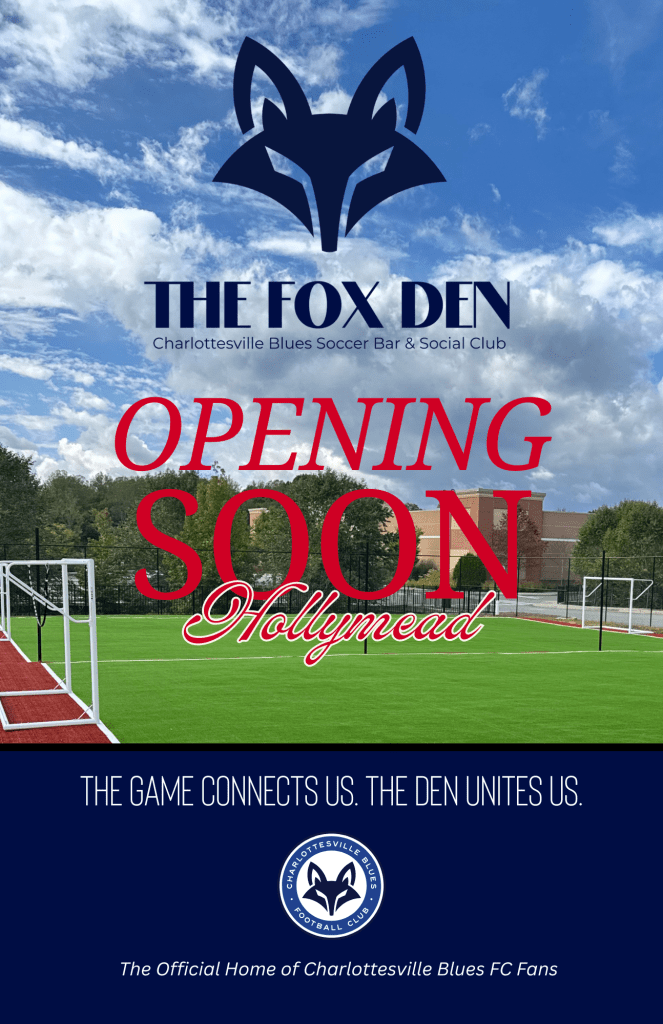 The Fox Den – Charlottesville Blues Soccer Bar and Social Club is the premier home for soccer fans in Charlottesville. It’s where Charlottesville Blues FC supporters and new fans come together to watch matches on the largest watch party screen in town, play on small-sided turf fields, enjoy great food and drinks, and connect with the local soccer community. Open to the public, with exclusive membership options available. The Fox Den is your year-round premium destination to celebrate the game, meet fellow fans, and be part of something bigger.